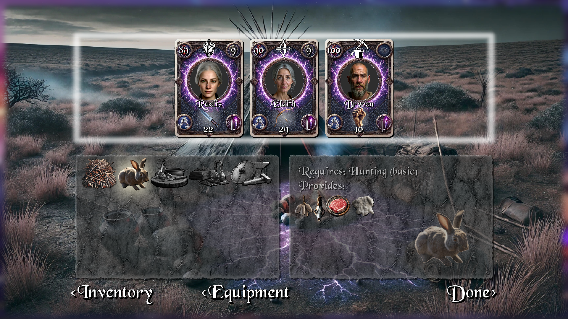 Camps allow players to gather nearby resources, craft equipment, and perform magical rituals.